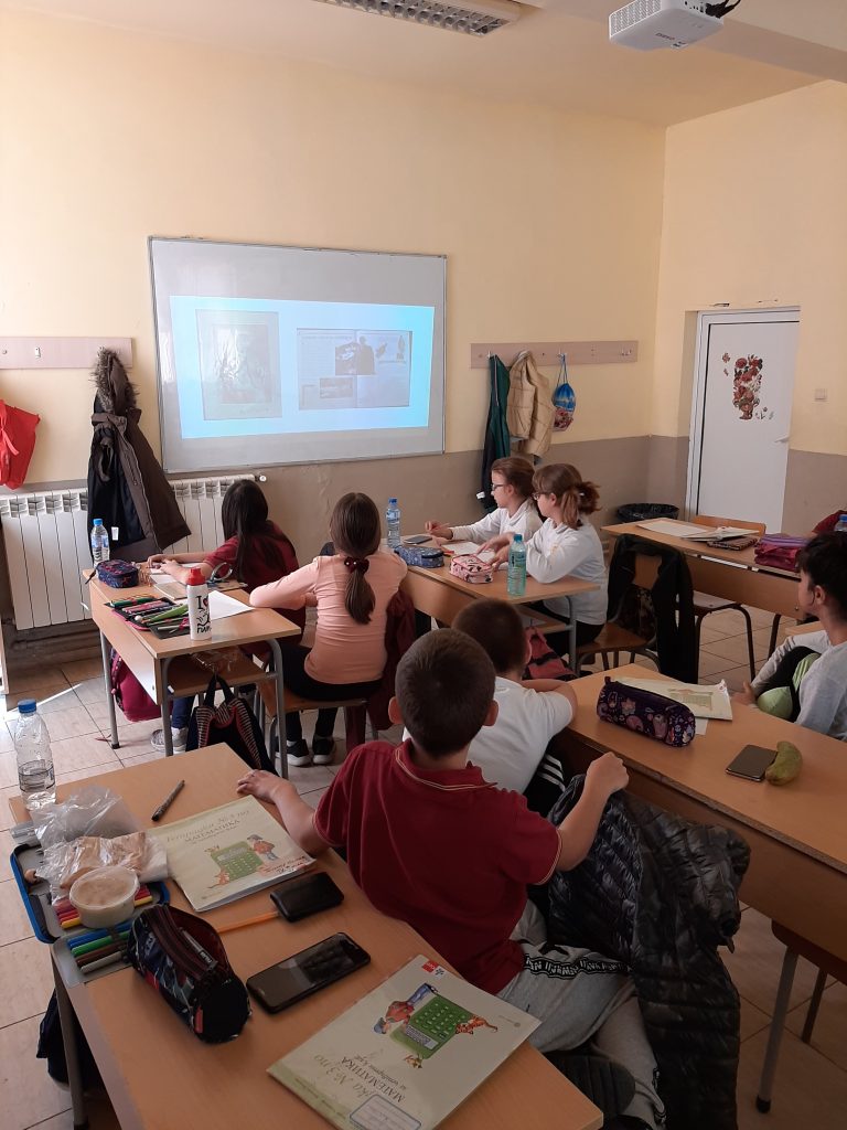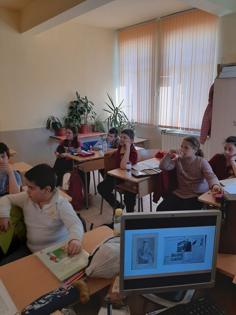С интерес децата гледаха презентацията „Животът на Вазов в снимки и картини“. След това участваха в беседа, посветена на живота и творчеството на Патриарха на българската литература.