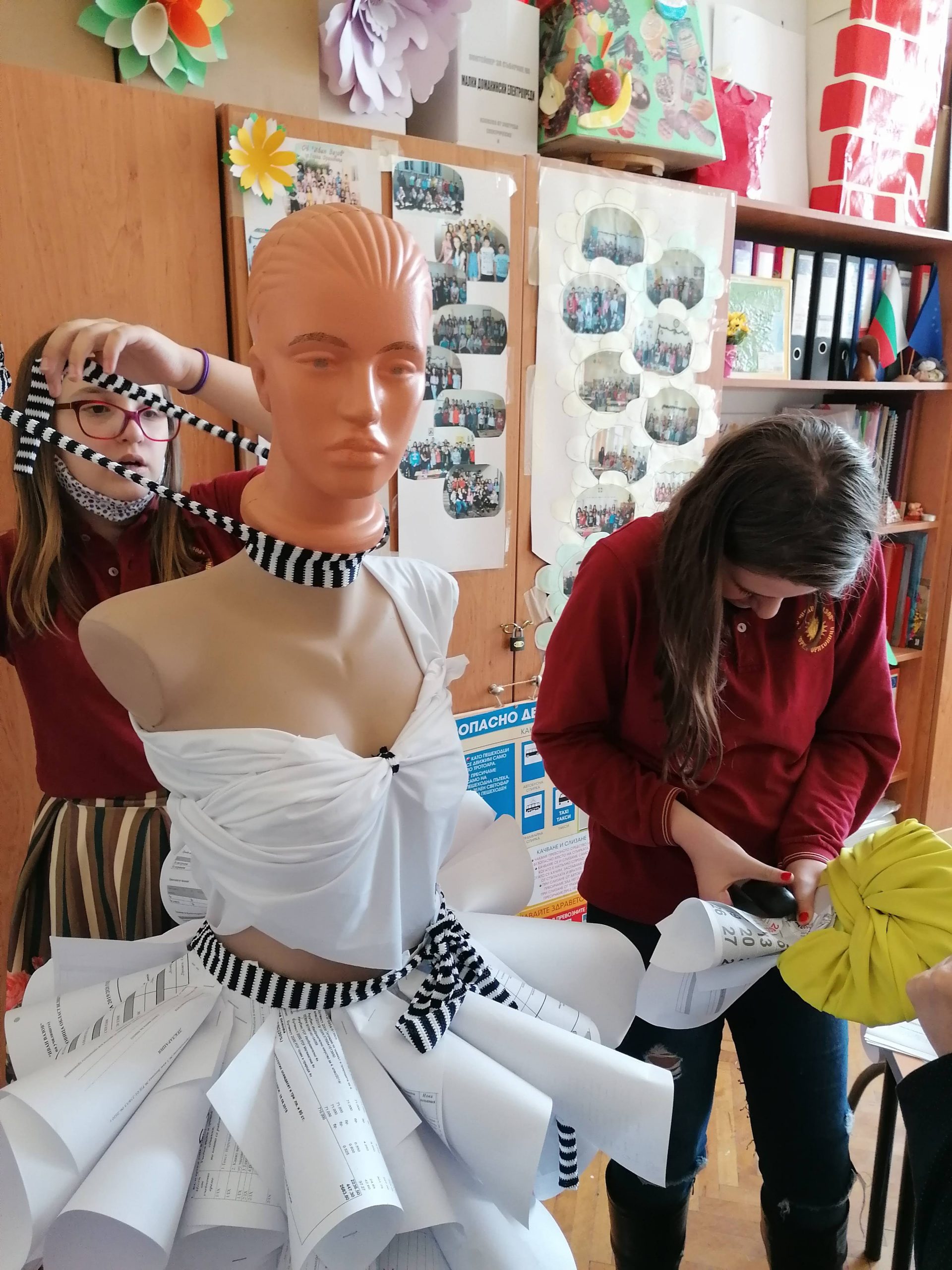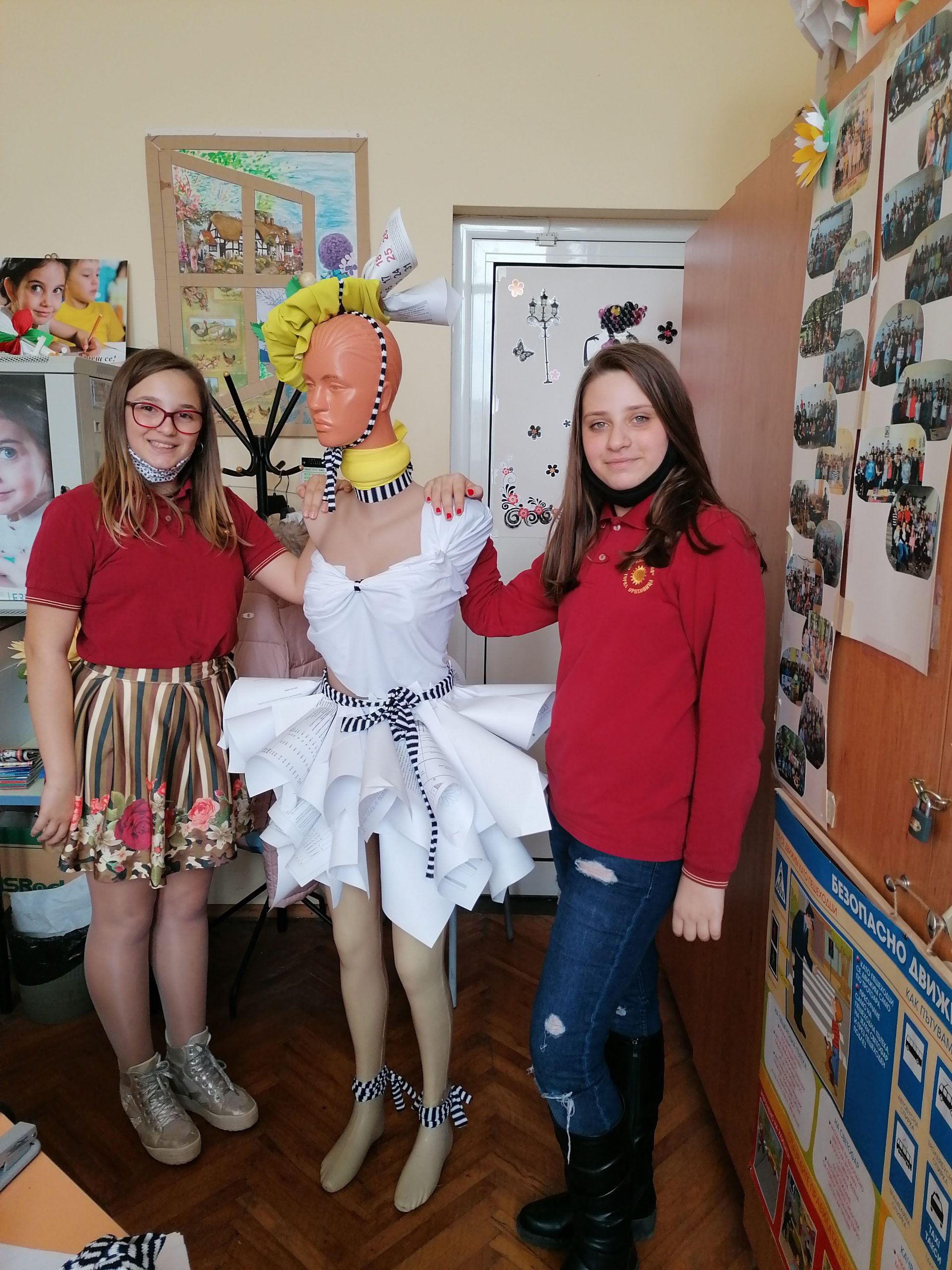 Ванеса Илиева и Ана-Мария Мамучевска от 6 А клас премениха своята приятелка Мадам Фифи и я разходиха в училище. Шестокласничките с ентусиазъм претвориха своите дизайнерско виждане и облякоха модела си с предизвикателен тоалет от рециклирани материали.