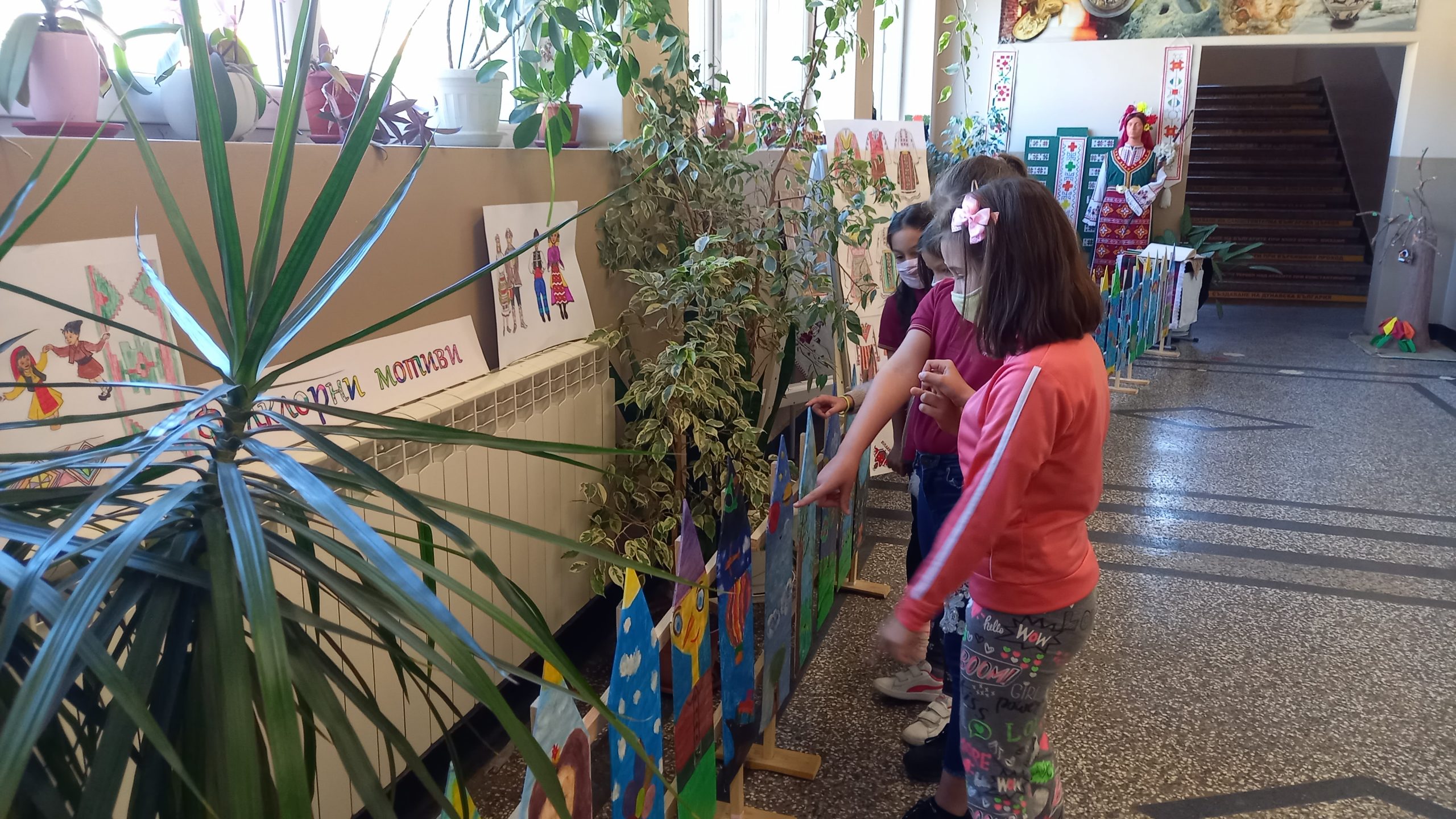 Заповядайте на нашата изложба „Фолклорни мотиви“, която можете да видите на първия етаж на училището.
