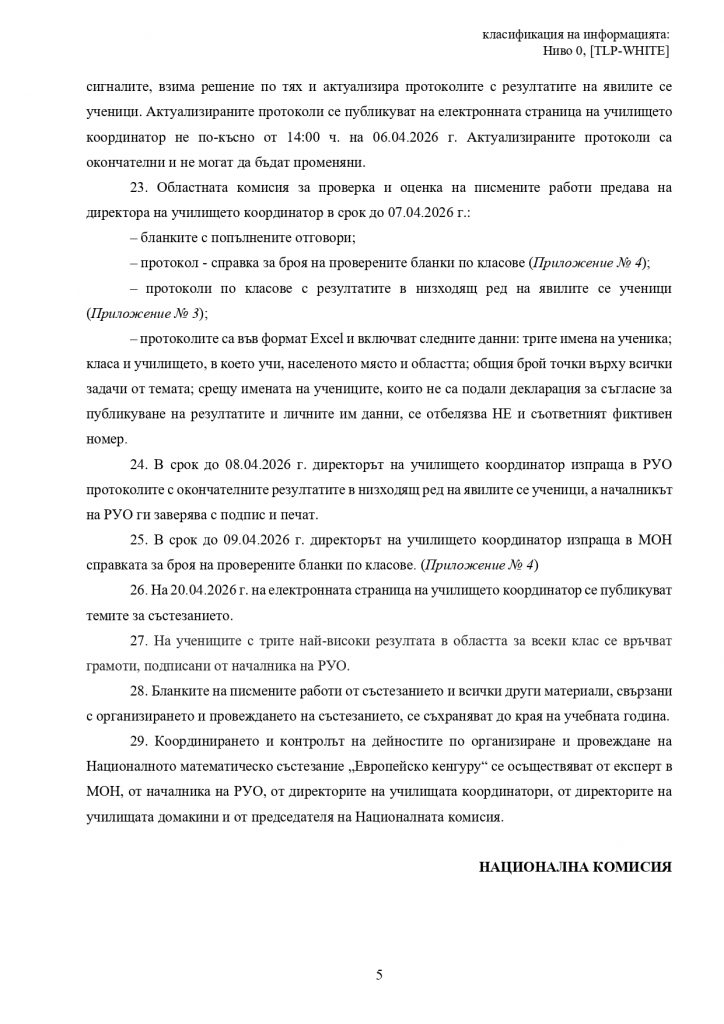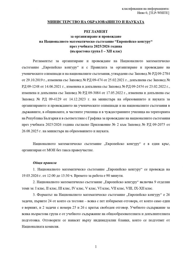 Във връзка със заповед № РД09-2075/26.08.2025 г. на министъра на образованието и науката за утвърждаване на график за провеждане на националните състезания през учебната 2025/2026 година и Регламент за организиране и провеждане на Националното математическо състезание „Европейско кенгуру“ през учебната 2025/2026 година Ви уведомявамe, че състезанието ще се проведе на 19.03.2026 г. (четвъртък) от 12:00 до 13:30 часа. Време за работа 90 минути.