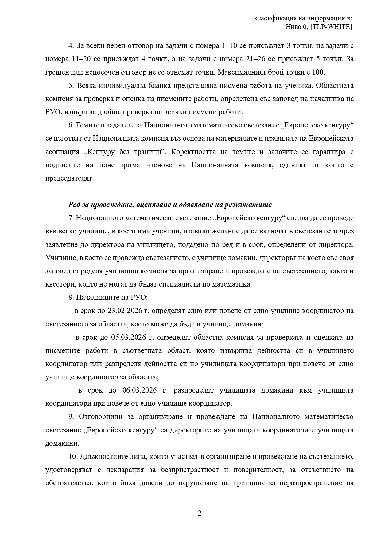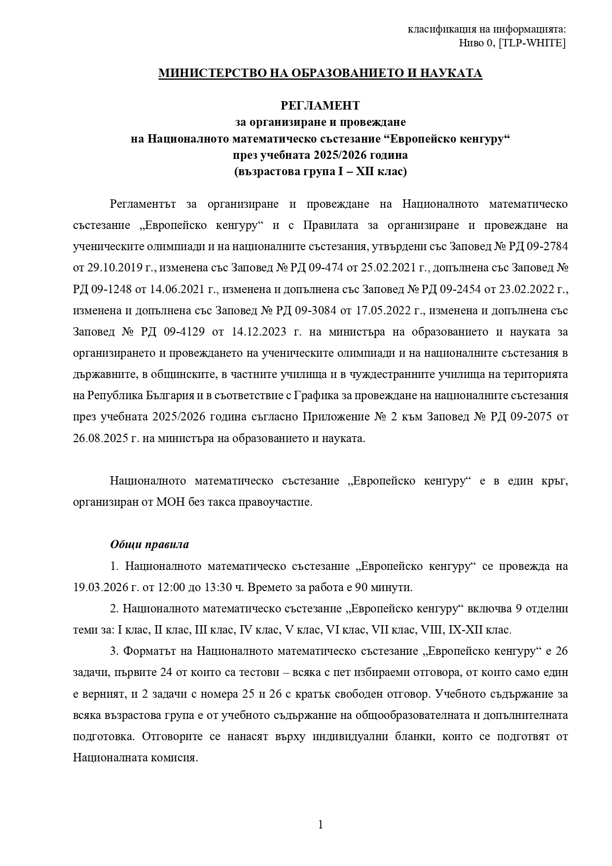 Във връзка със заповед № РД09-2075/26.08.2025 г. на министъра на образованието и науката за утвърждаване на график за провеждане на националните състезания през учебната 2025/2026 година и Регламент за организиране и провеждане на Националното математическо състезание „Европейско кенгуру“ през учебната 2025/2026 година Ви уведомявамe, че състезанието ще се проведе на 19.03.2026 г. (четвъртък) от 12:00 до 13:30 часа. Време за работа 90 минути.