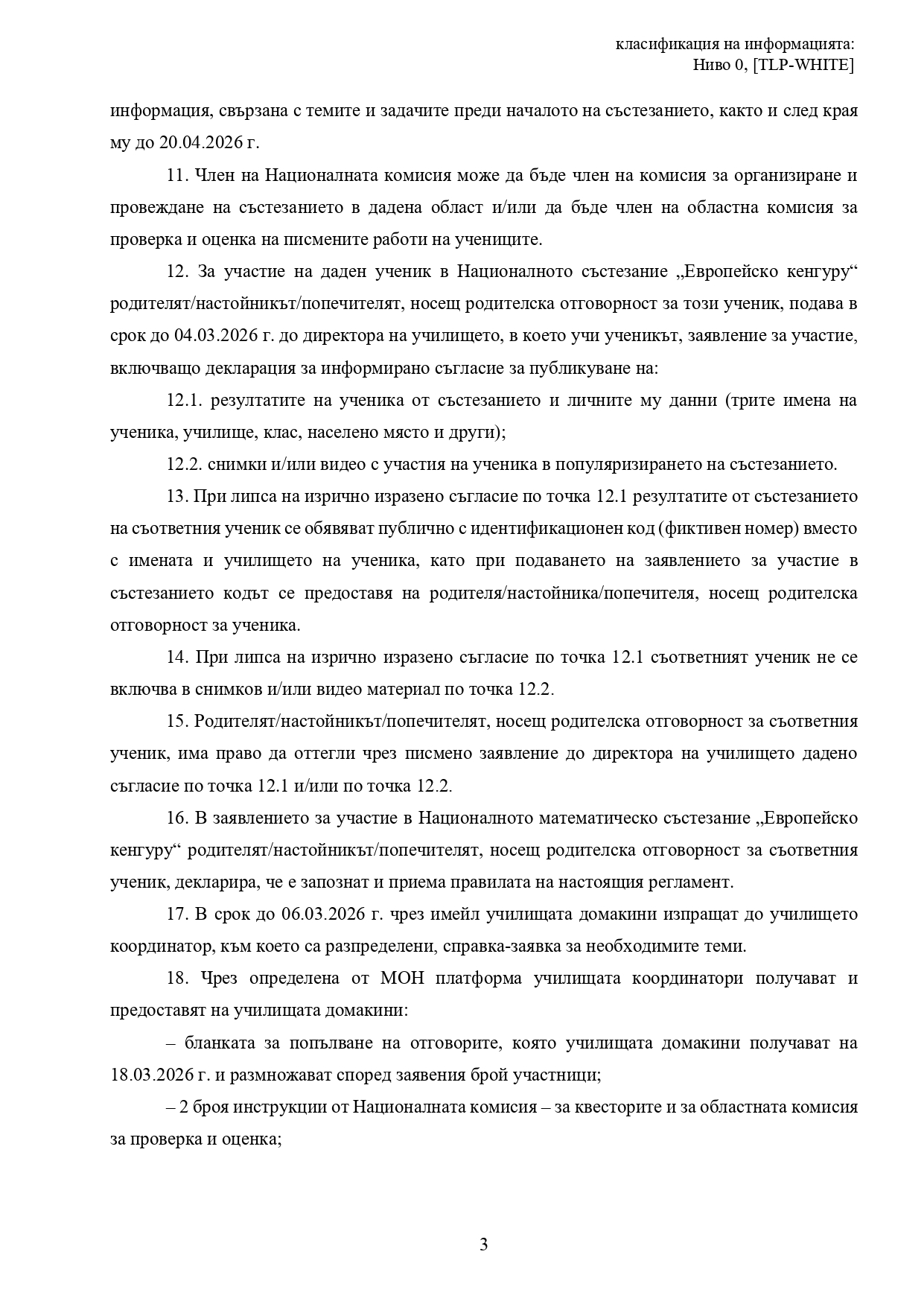 За участие на даден ученик в Националното състезание „Европейско кенгуру“ родителят/настойникът/попечителят, носещ родителска отговорност за този ученик, подава в срок до 04.03.2026 г. до директора на училището, в което учи ученикът, заявление за участие и декларация за информирано съгласие за публикуване на: