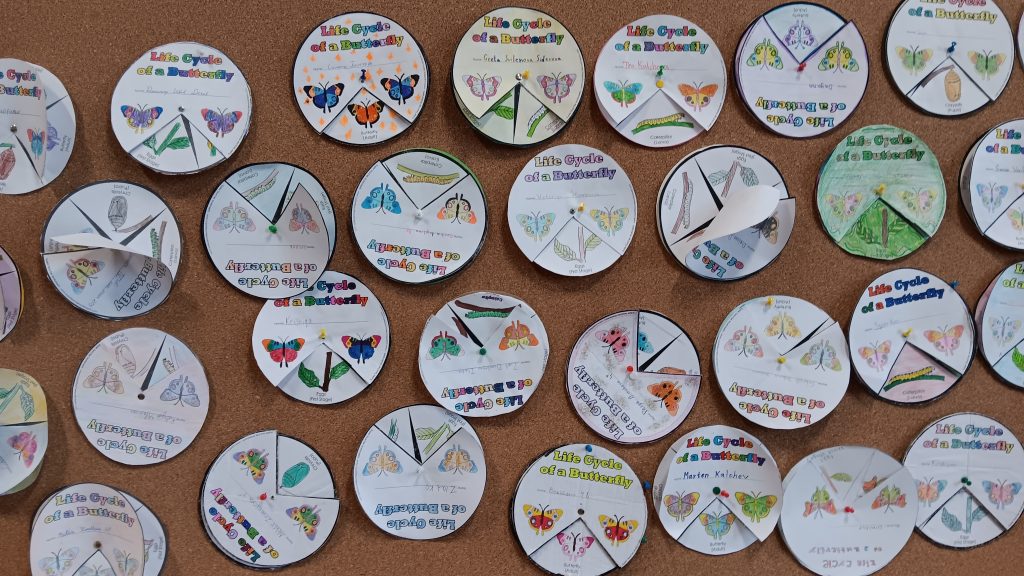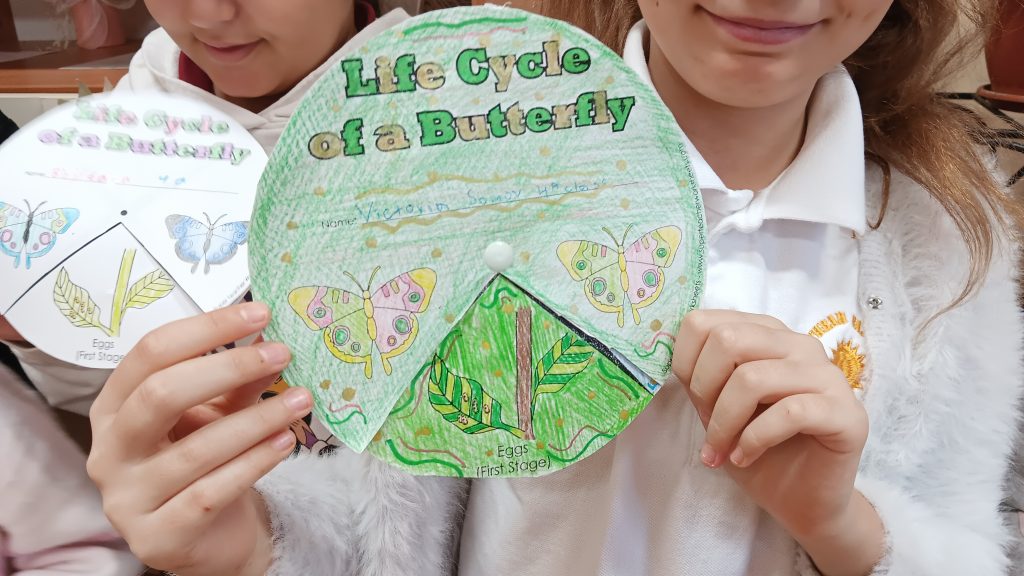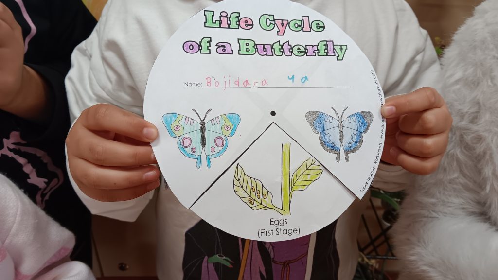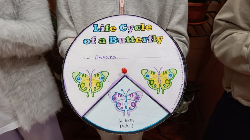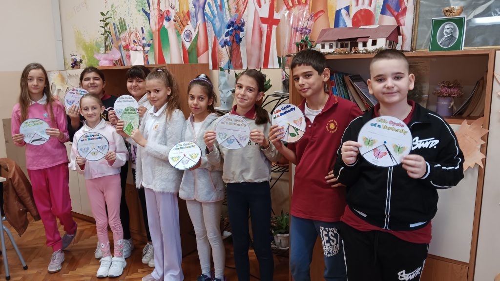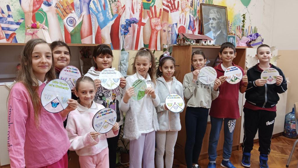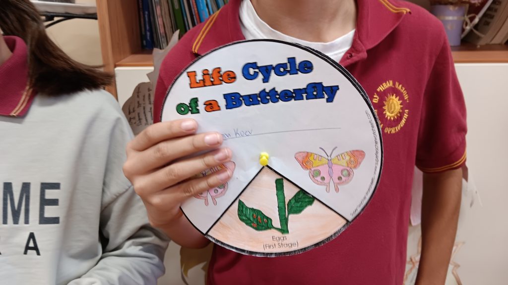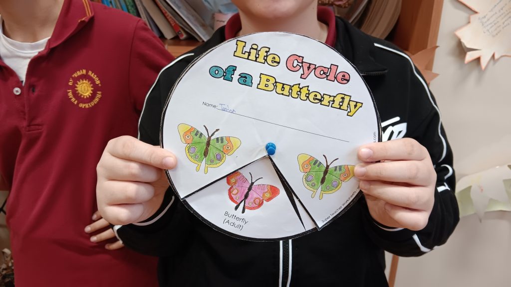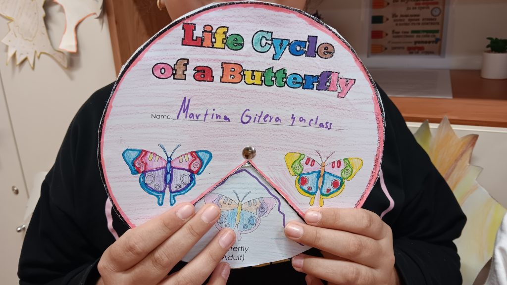 Четвъртокласници работиха в продължение на няколко учебни часа по интердисциплинарен проект „The Life Cycle of a Butterfly“ под ръководството на преподавателите си по английски език Светлана Ненова и Гергана Павлова. Урокът представи на учениците жизнения цикъл на пеперудата – модел на раждане, растеж, размножаване и смърт, общ за живите организми, които преминават през уникални промени. С помощта на интерактивни задачи децата не само усвоиха нови знания, но и демонстрираха умения, придобити в часовете по изобразително изкуство, технологии и предприемачество, и човекът и природата, представяйки финалния си проект изцяло на английски език.